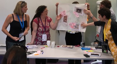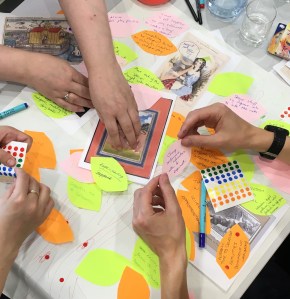 After the trees had been thoroughly covered in leaves each group then identified their top three actions to encourage playfulness in a professional setting and then presented this as a storyboard to the entire room using the archetype postcard images.